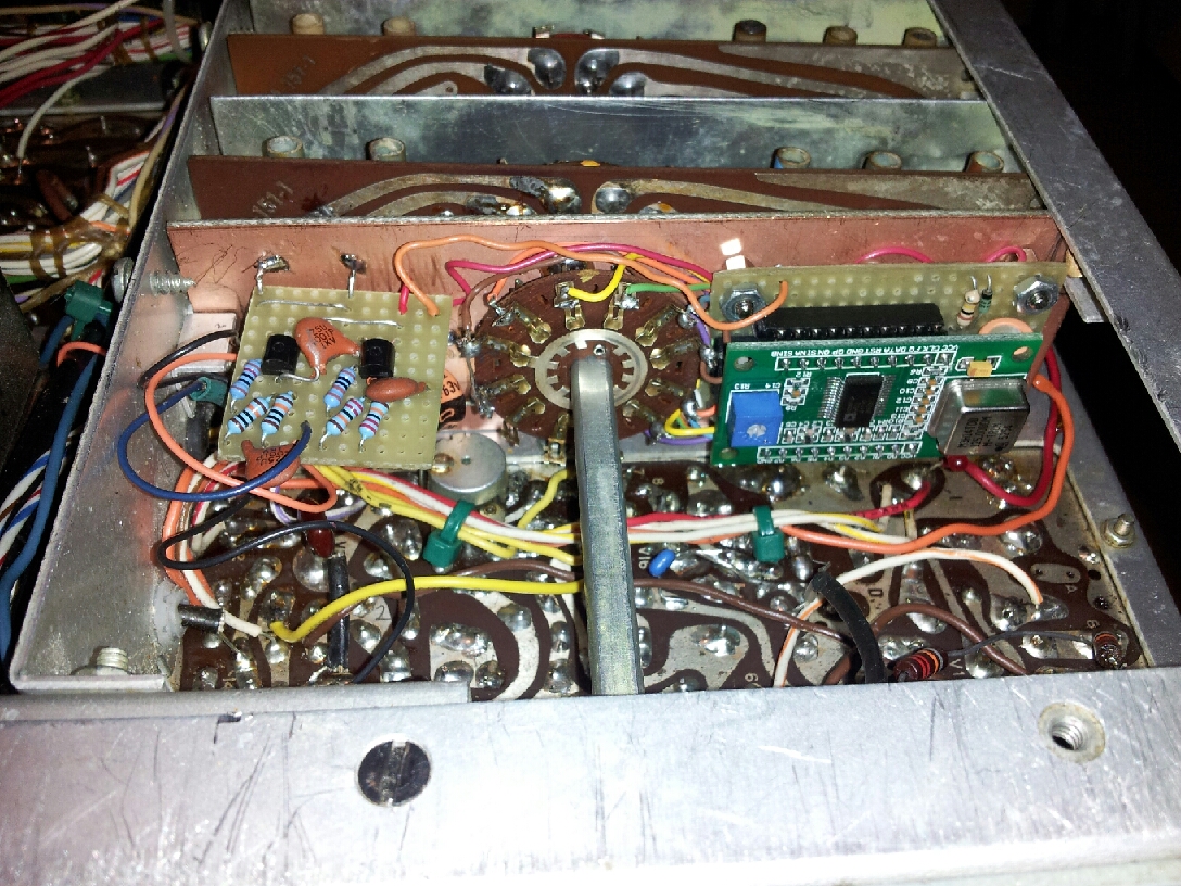 The output buffering has been reduced to one stage since last posted. I used an MPS-A05 for the transistor since I buy these by the hundred. 2N2222s or 2N3904s may work fine. Don't align the hetrodyne coils per the instructions. Instead, monitor the output of V19A (pin6) and peak the signal for each range. Re-peak them for power out when aligning the RF Driver and Driver Plate cards. Here's a photo of the board installed.
