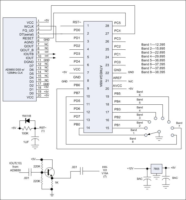 This has been a long term project I went back to. These old crystals lose their activity and are nearly impossible to find. I built my home-brew transmitter based on the Chinese AD9850 synthesizers available for a few dollars and used the ATMEGA168 to control it. Along the line I had purchased some spare boards to replace some of my troubled ones and used a wafer switch from one to indicate the desired frequency to the microcontroller. Here's the schematic I came up with.